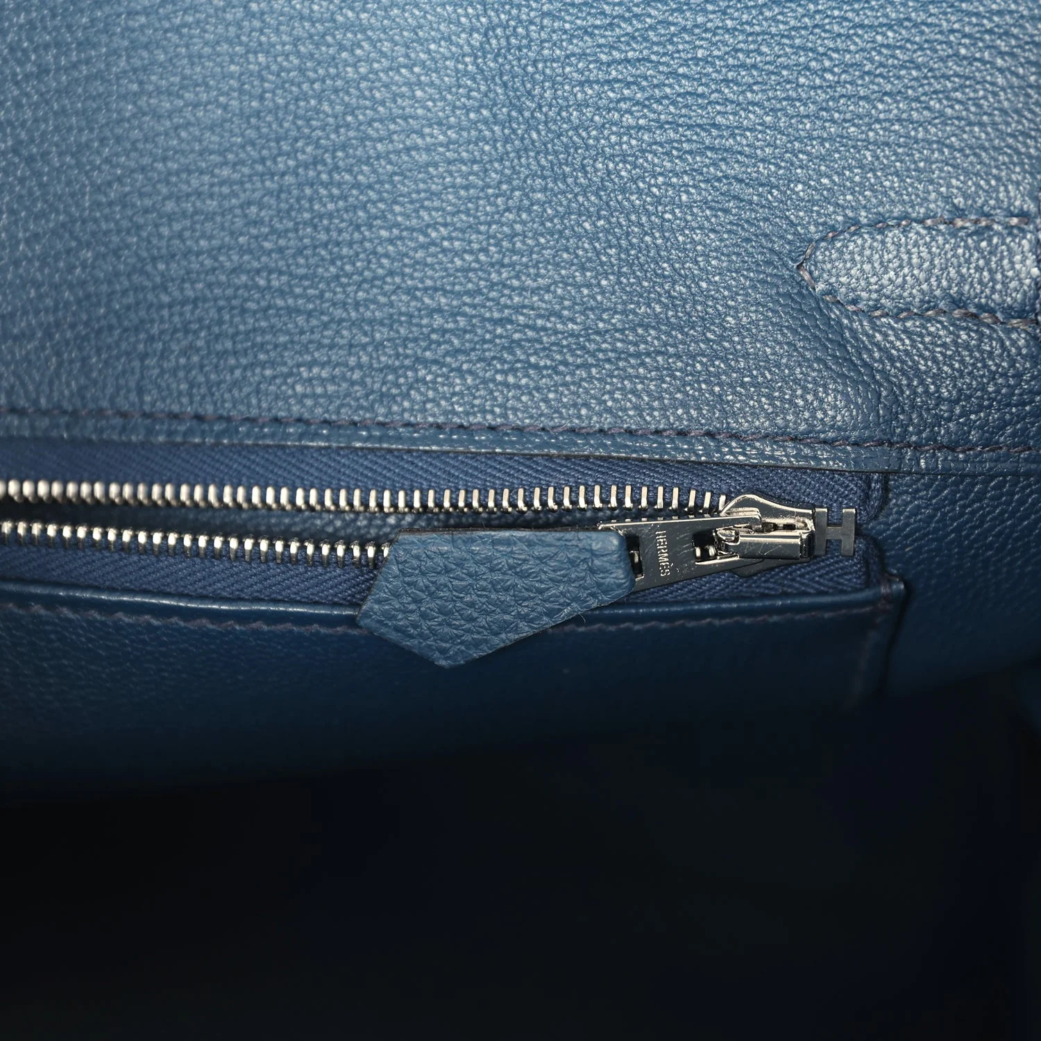 This Birkin is in Bleu De Prusse Togo leather with palladium hardware, has tonal stitching, front flap, two straps with center toggle closure, clochette with lock and two keys, and double rolled handles.