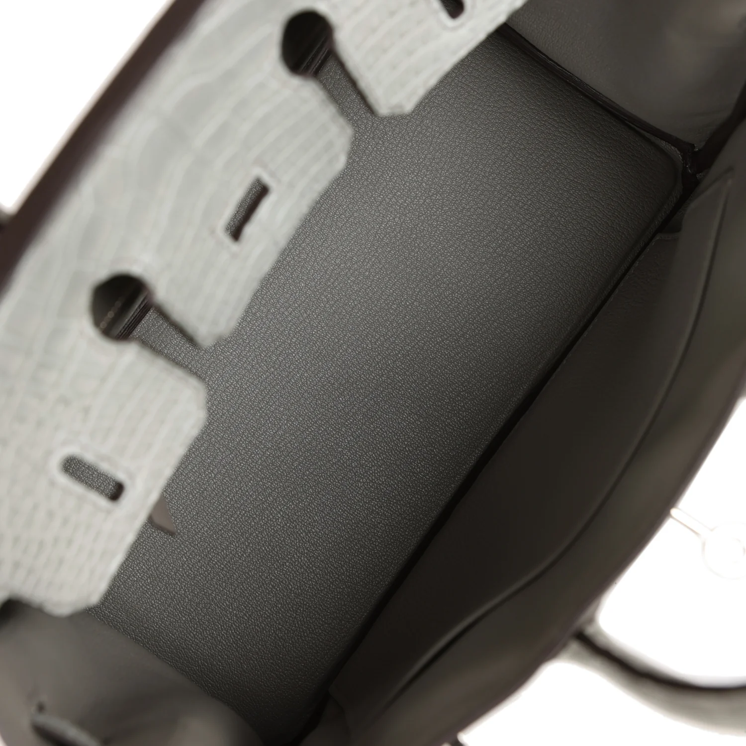 The interior is lined with Gris Meyer chevre and has one zip pocket with an Hermès engraved zipper pull and an open pocket on the opposite side.