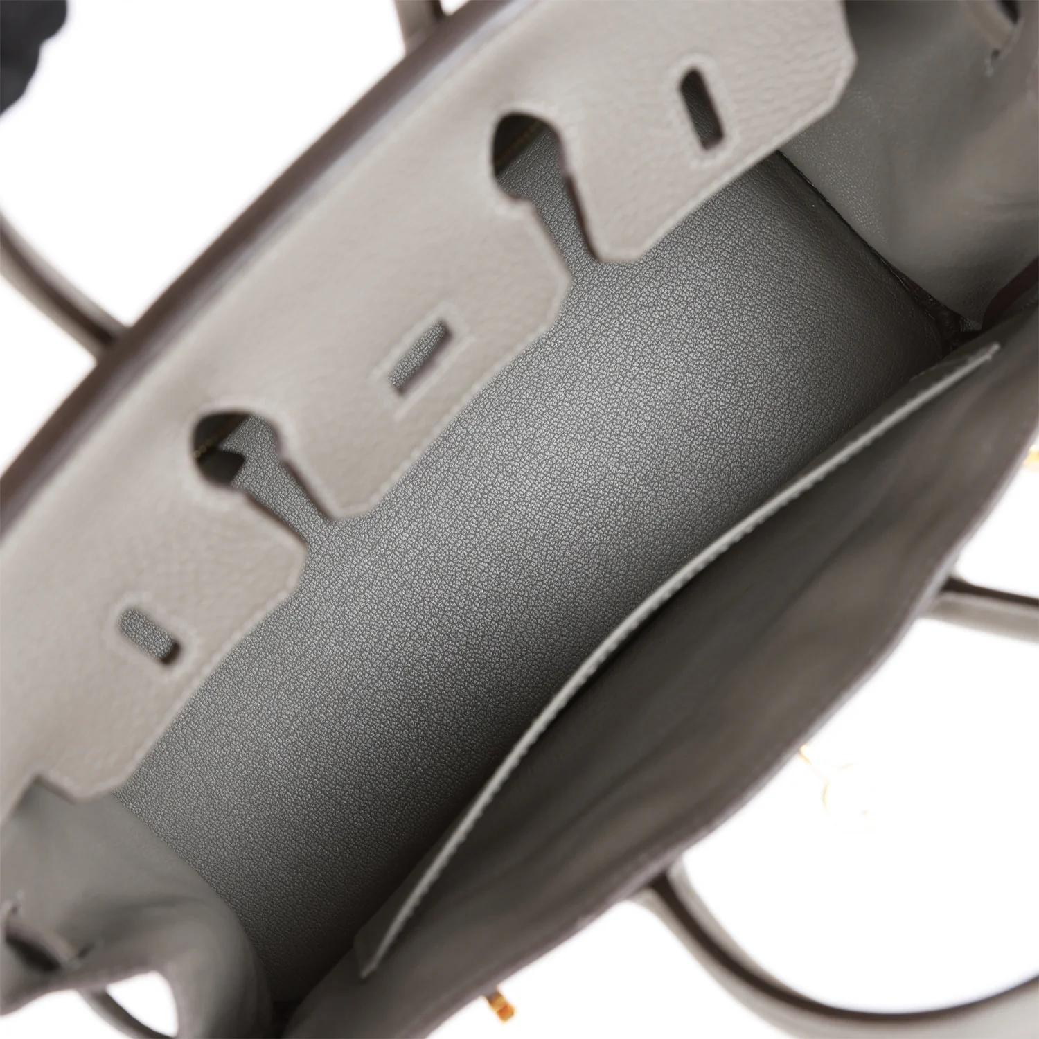 The interior is lined with Gris Meyer chevre and has a zip pocket with an Hermès engraved zipper pull and an open pocket on the opposite side.