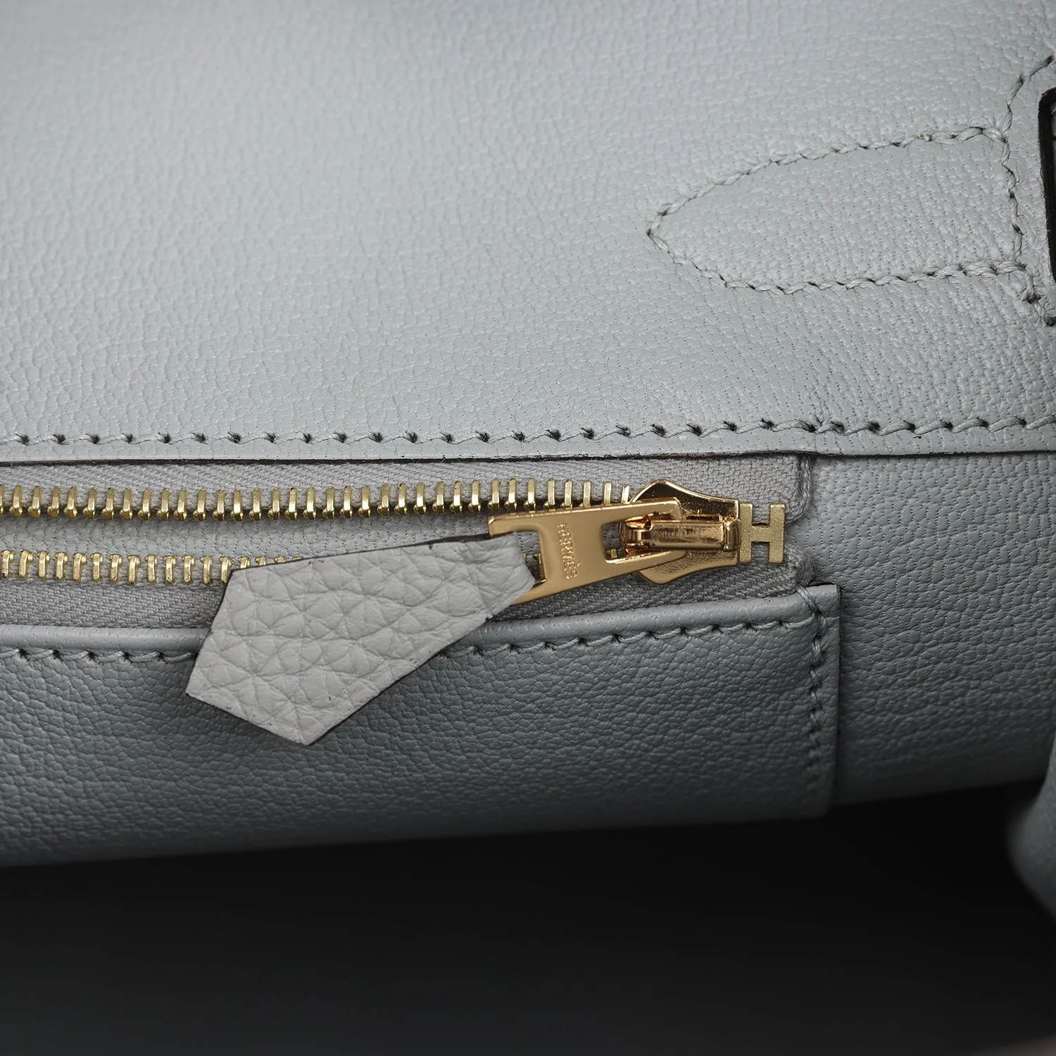 The interior is lined with Bleu Glacier chevre leather and has one zip pocket with an Hermès engraved zipper pull and an open pocket on the opposite side.