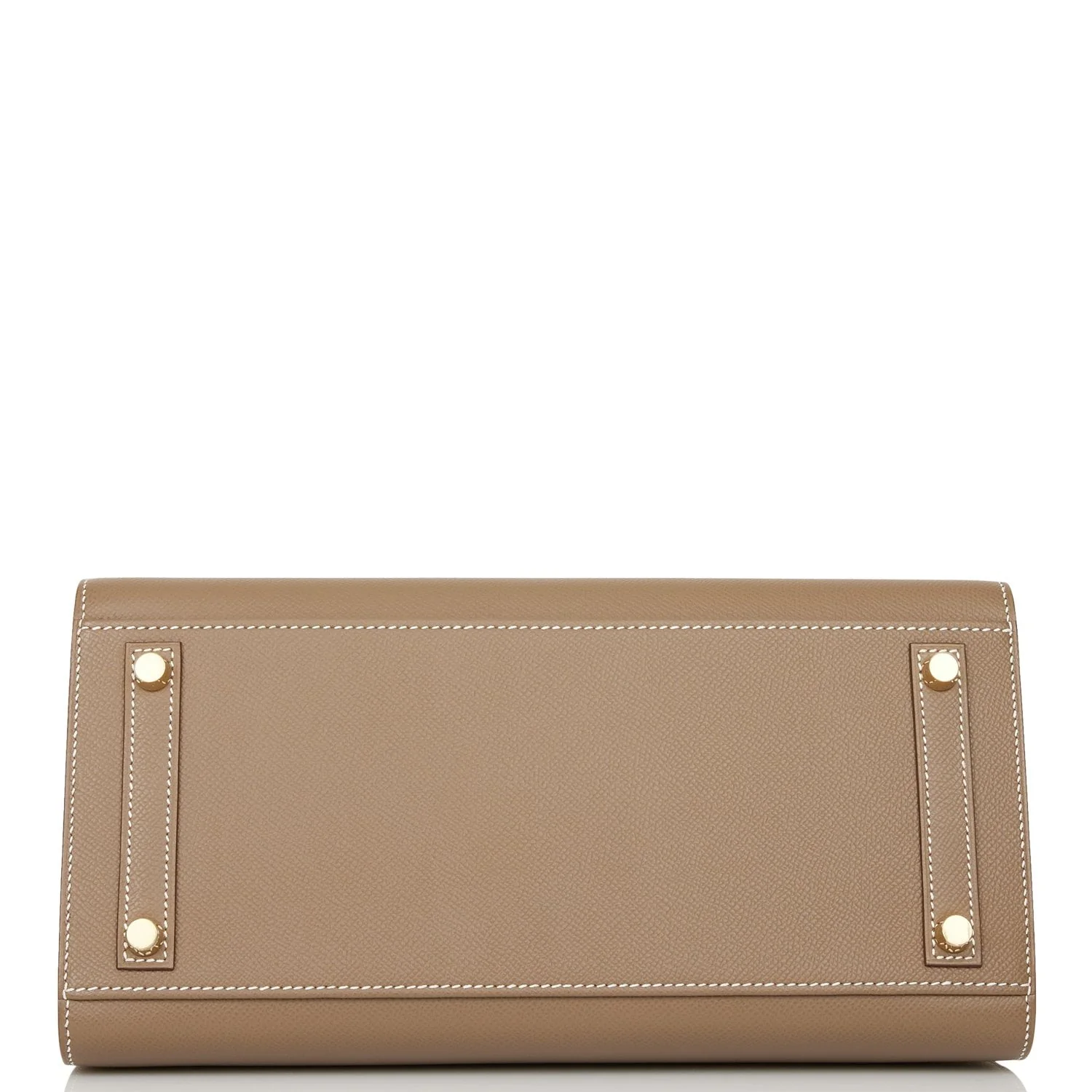 This Sellier Birkin is in Etoupe epsom leather with gold hardware and has contrast stitching, front flap, two straps with center toggle closure, clochette with lock and two keys, and double rolled handles.