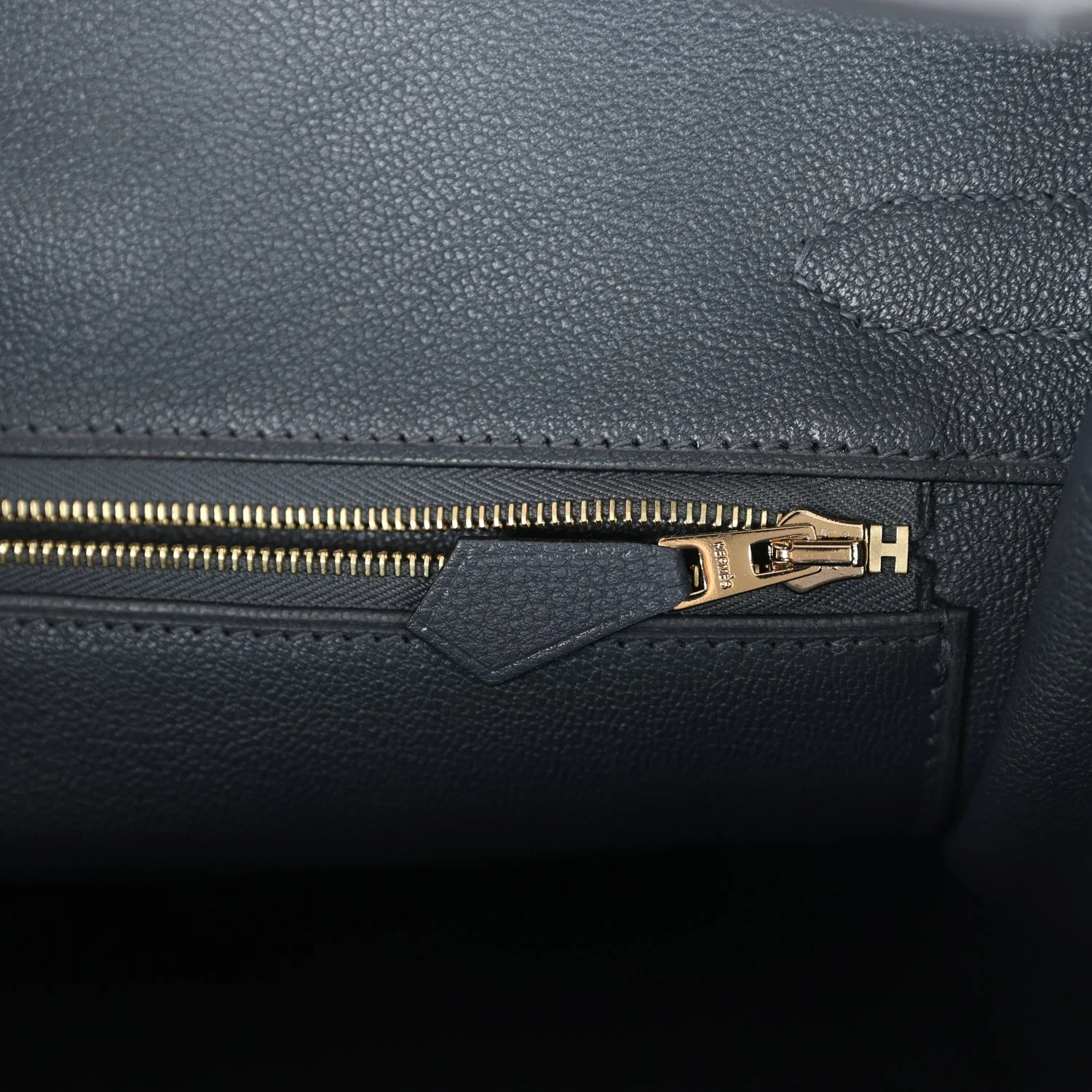 The interior is lined with Gris Misty chevre and has one zip pocket with an Hermes engraved zipper pull and an open pocket on the opposite side.