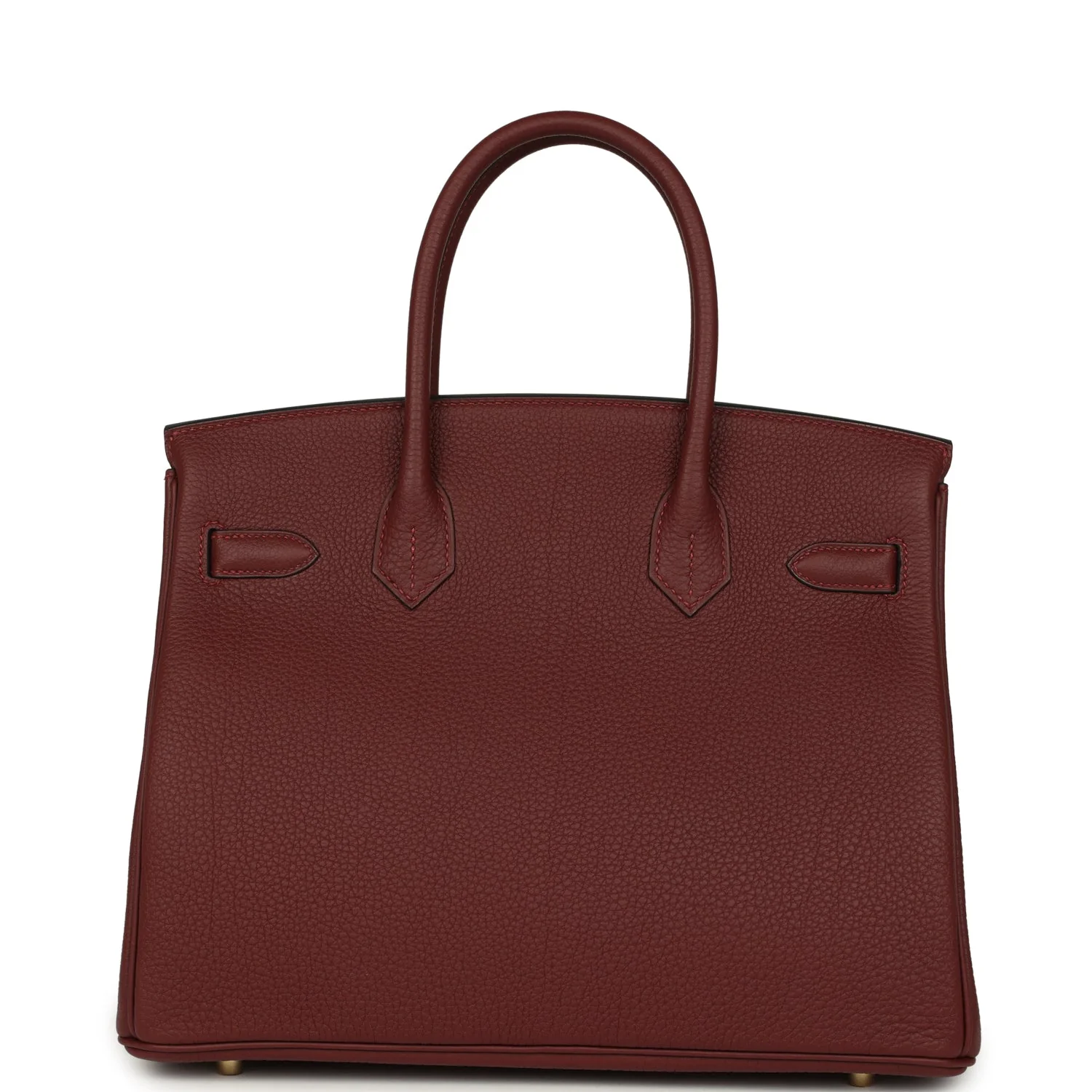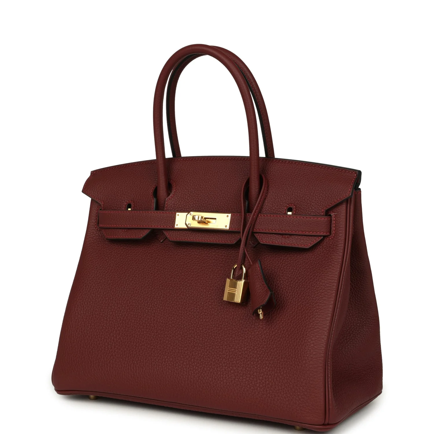 This Birkin is in Rouge H togo leather with gold hardware and has tonal stitching, front flap, two straps with center toggle closure, clochette with lock and one key, and double rolled handles.