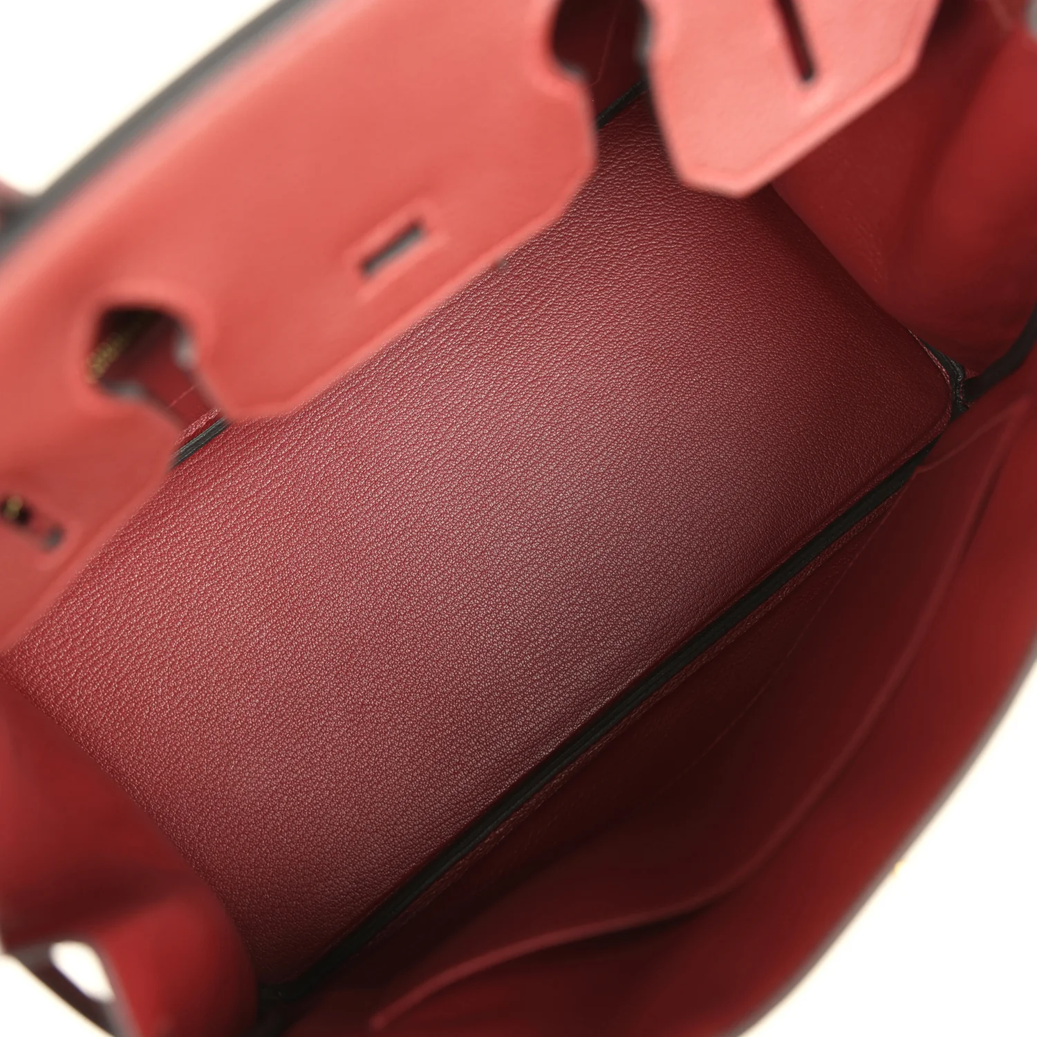 The interior is lined with Rouge H chevre and has one zip pocket with an Hermès engraved zipper pull and an open pocket on the opposite side.