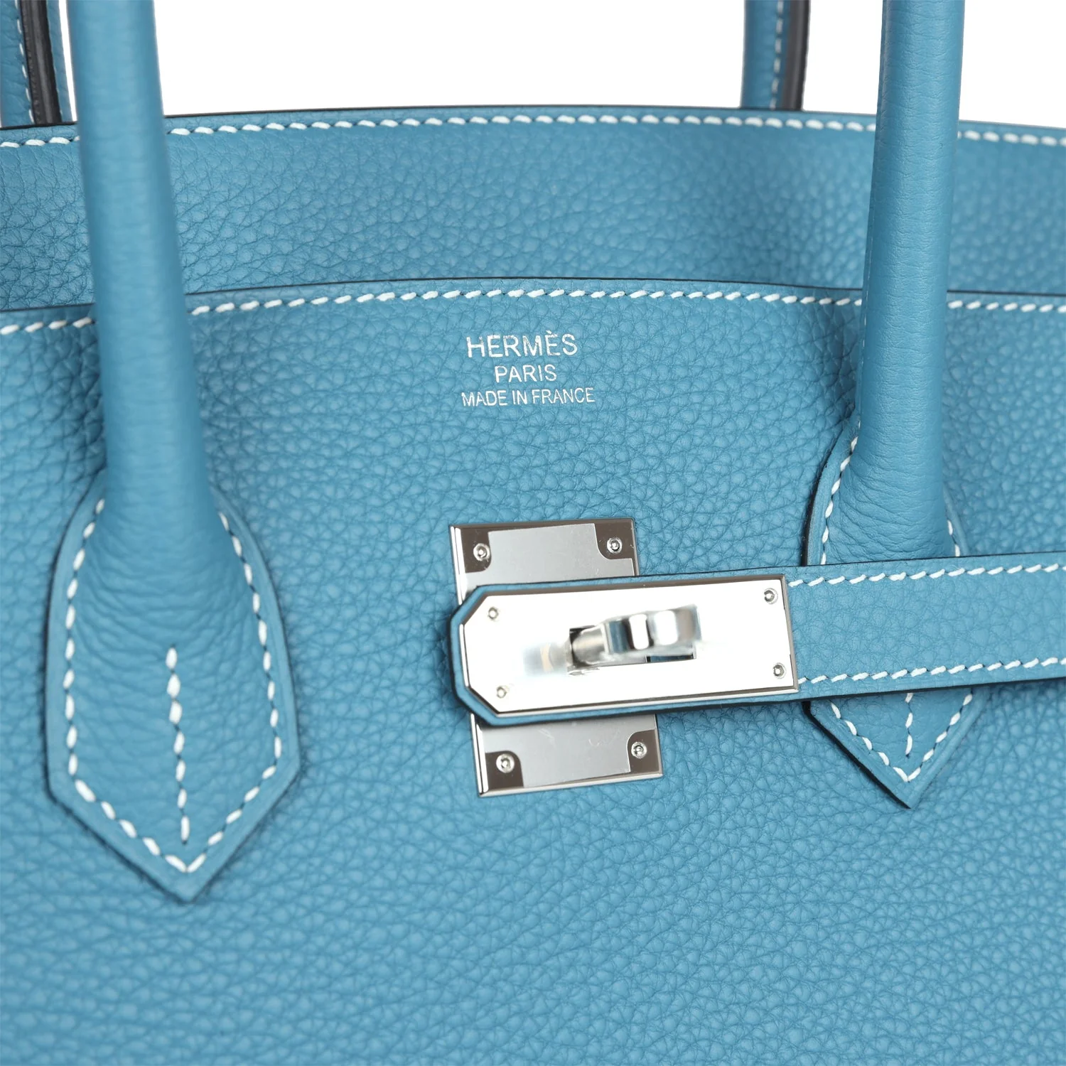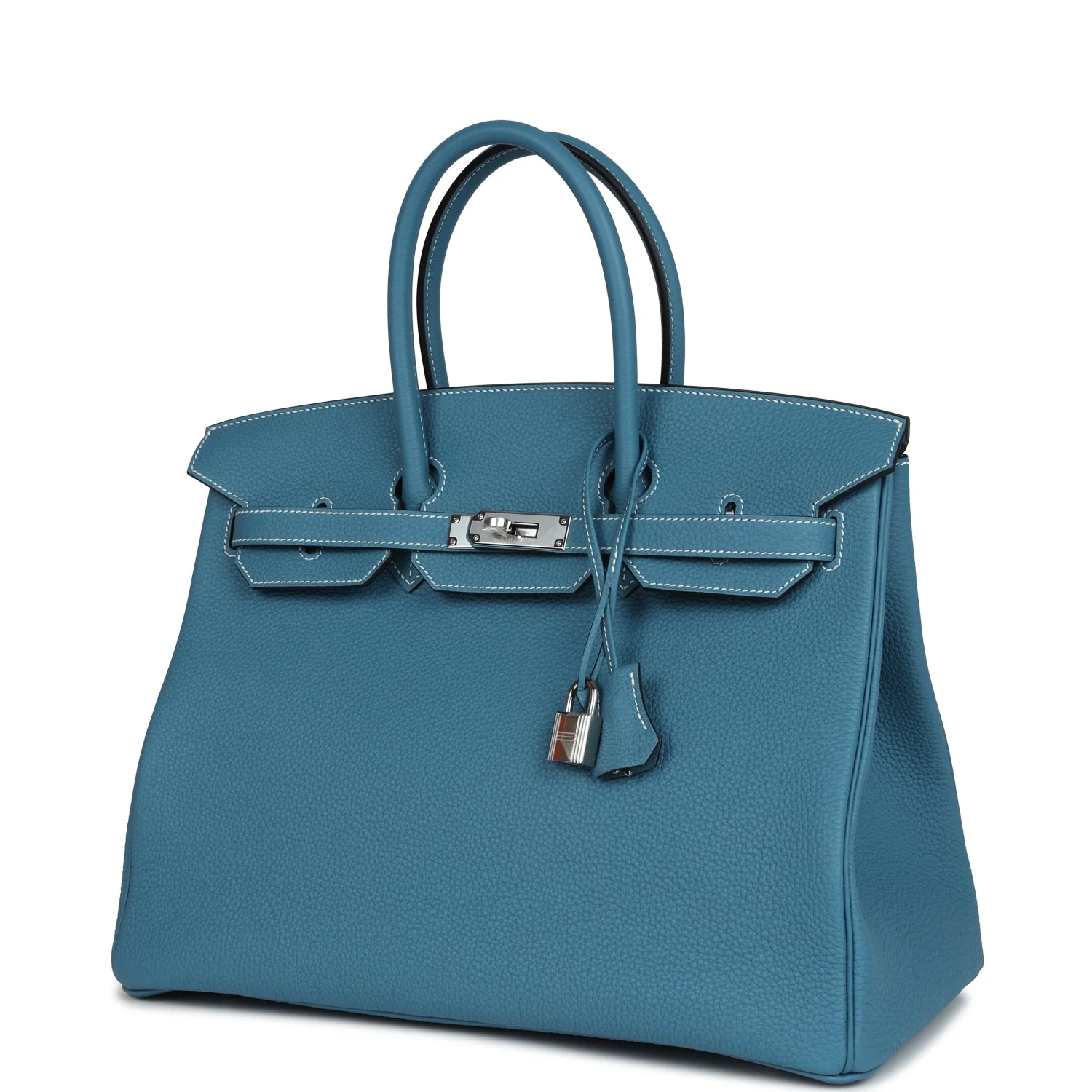 This Birkin is in New Blue Jean togo leather with palladium hardware and has white contrast stitching, front flap, two straps with center toggle closure, clochette with lock and two keys, and double rolled handles.