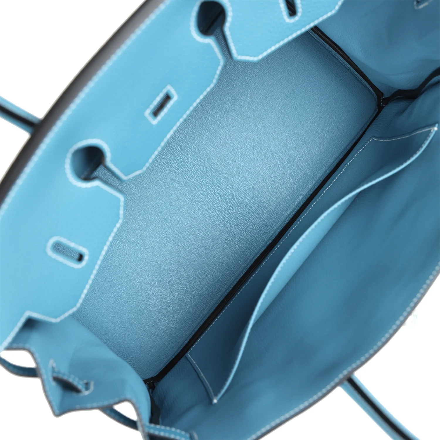 The interior is lined with Blue Jean chevre and has one zip pocket with an Hermes engraved zipper pull and an open pocket on the opposite side.