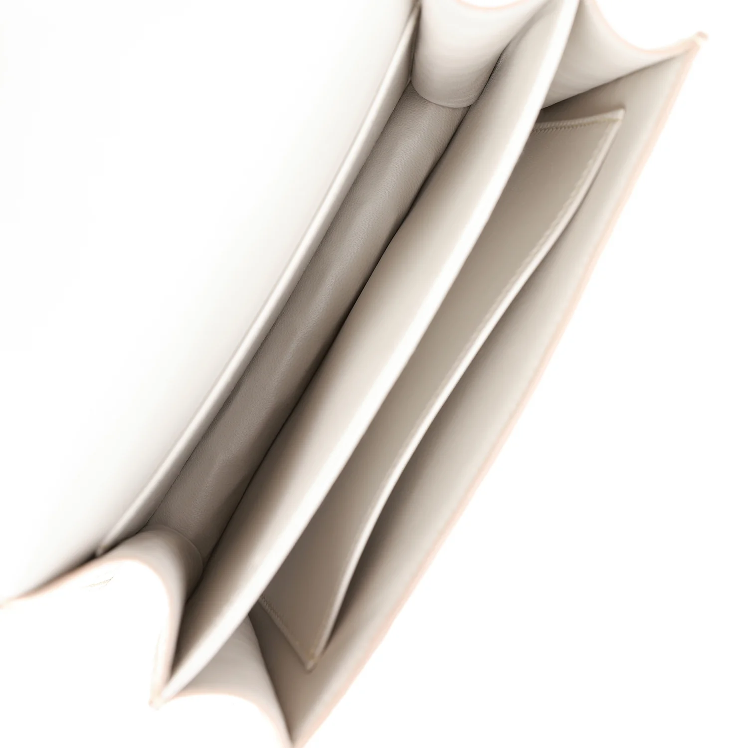 The interior is lined with Beton lambskin and has an open pocket on the front wall, a center divide, and a slit pocket on the back wall.
