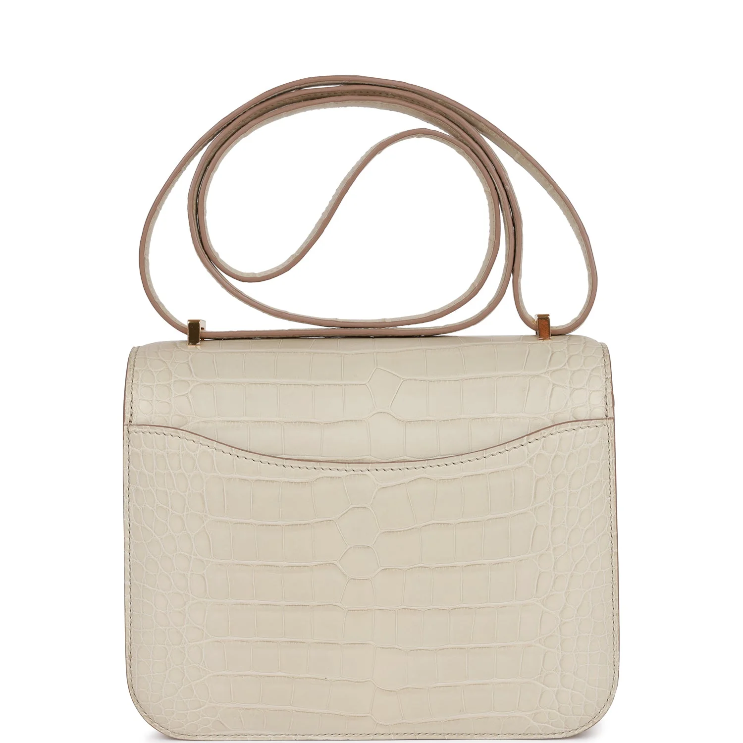 This Constance is of Beton matte alligator with gold hardware and features tonal stitching, a "H" snap lock closure, and an adjustable shoulder strap.