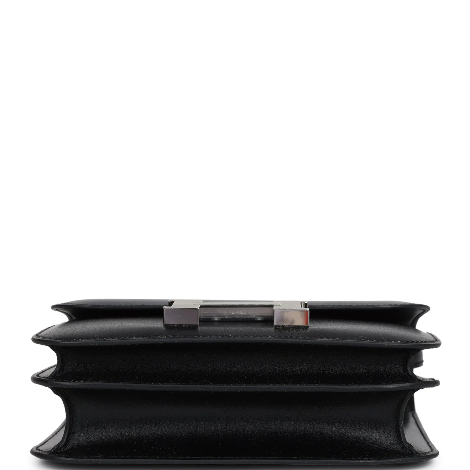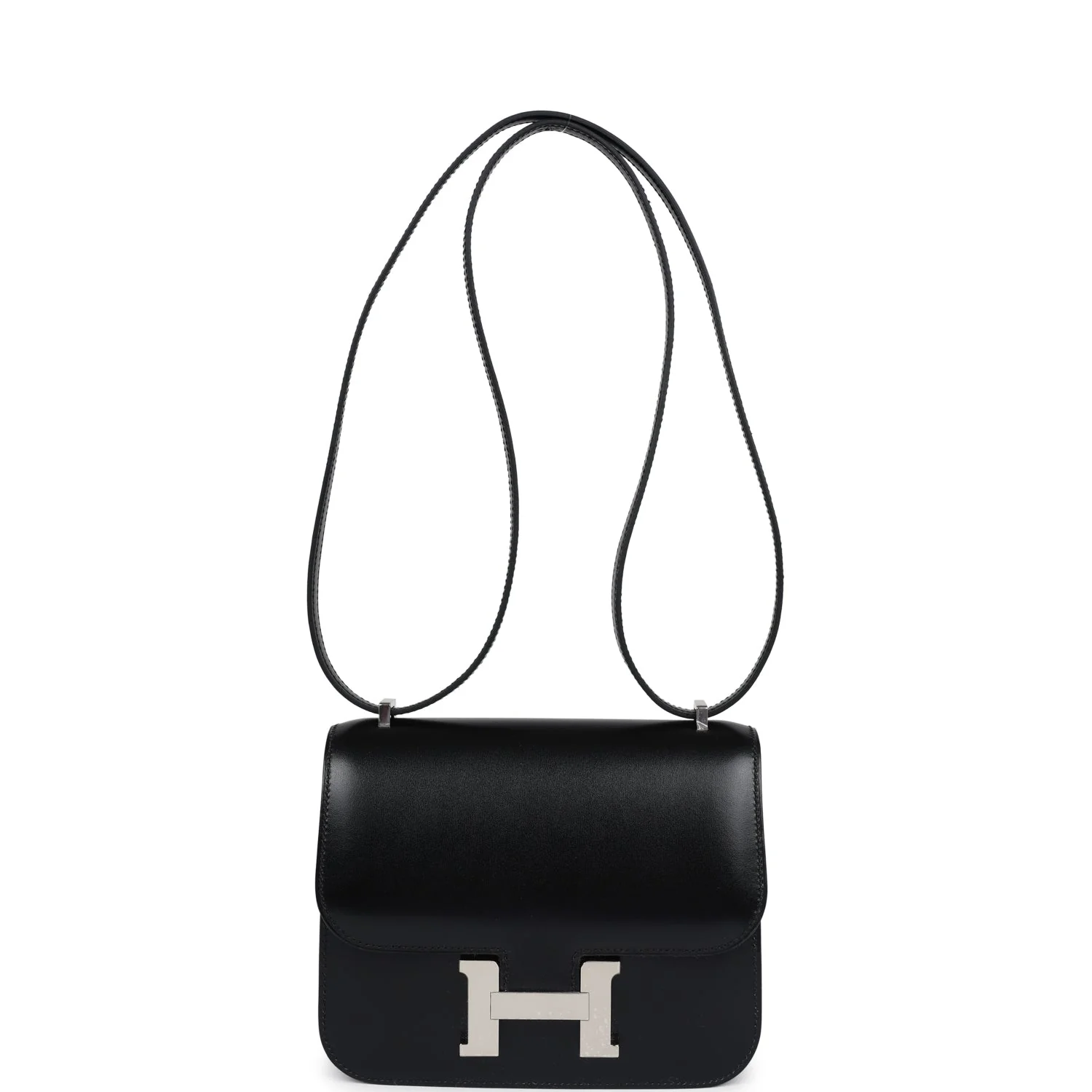 This Constance is in Black box calf leather with palladium hardware and has tonal stitching, a metal "H" snap lock closure and adjustable shoulder strap.