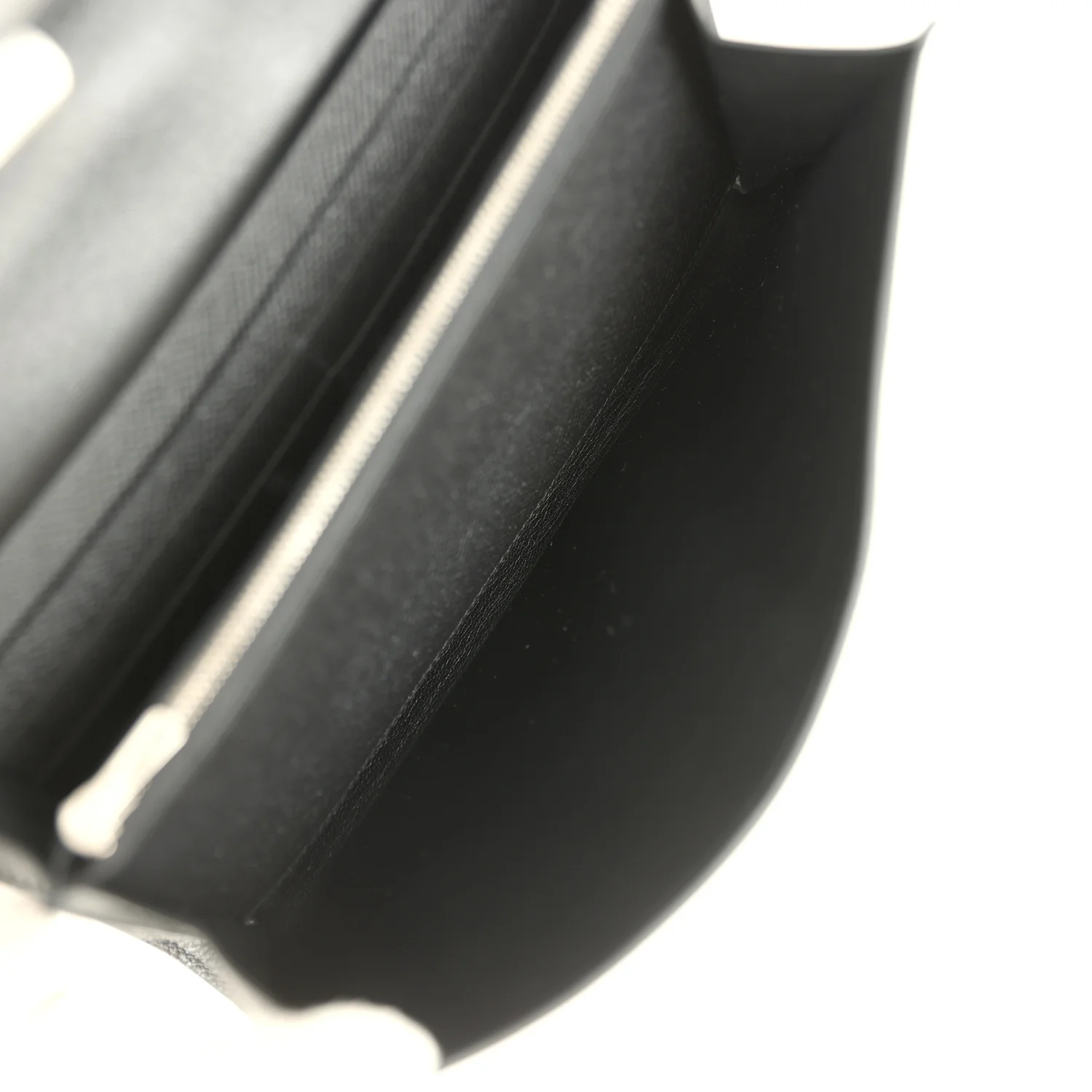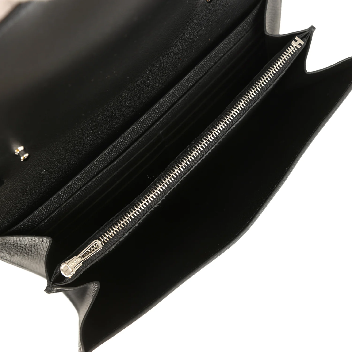 The interior is lined with Black epsom leather and has two main compartments with six credit card slots and a zippered center compartment with Hermès H lock pull.