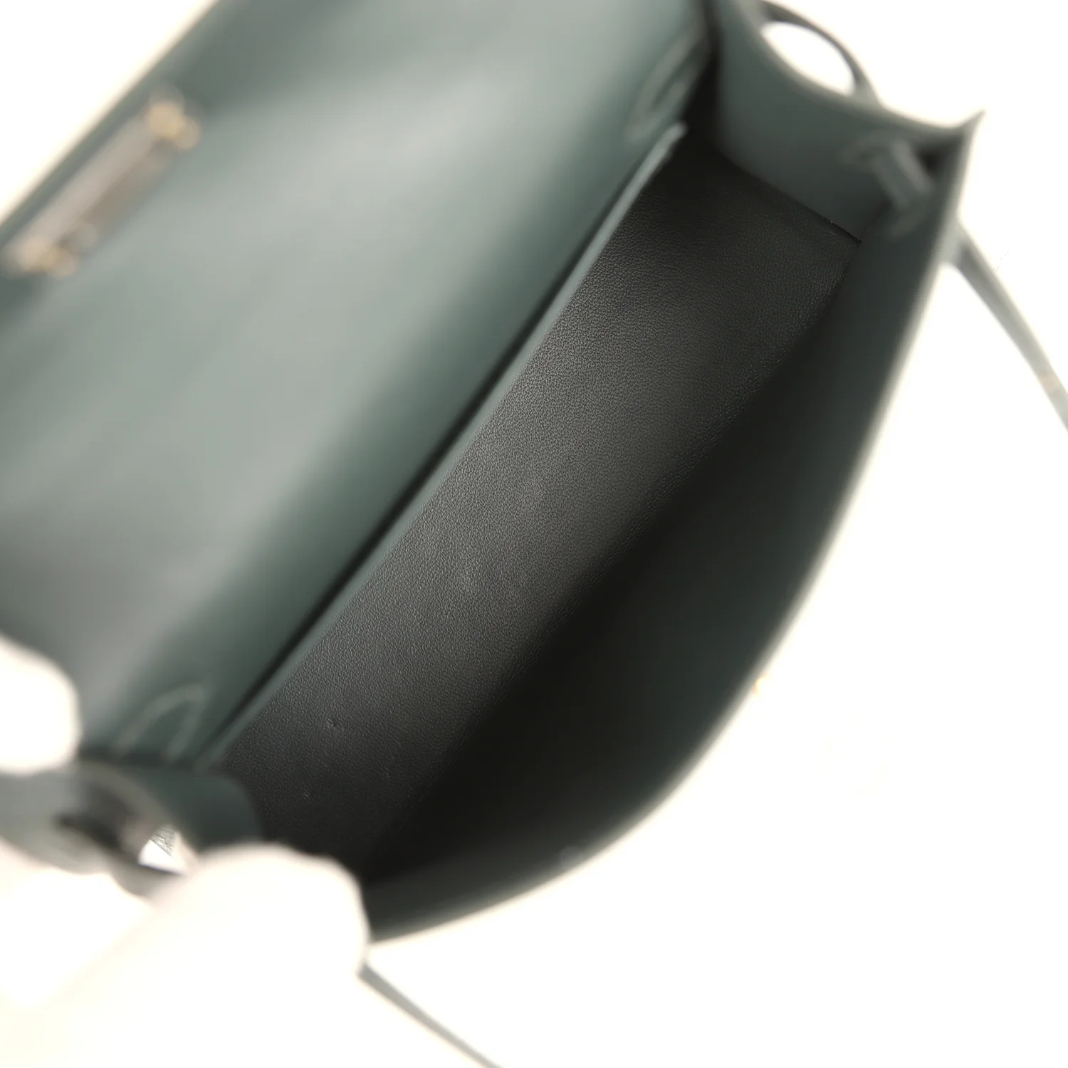 The interior is lined with Vert Mangrove lambskin leather and has one open pocket on the back wall.