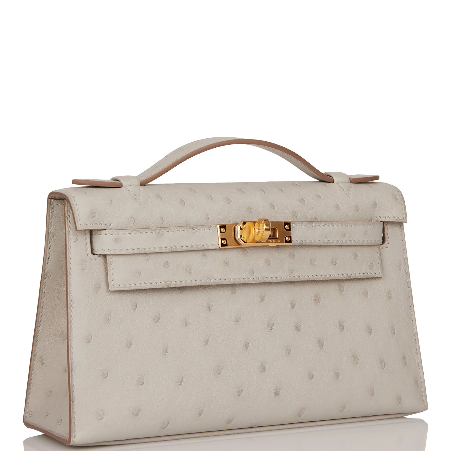 This Mini Kelly Pochette is in Gris Perle ostrich with gold hardware and has tonal stitching, front flap, two straps with center toggle closure and a top flat handle.