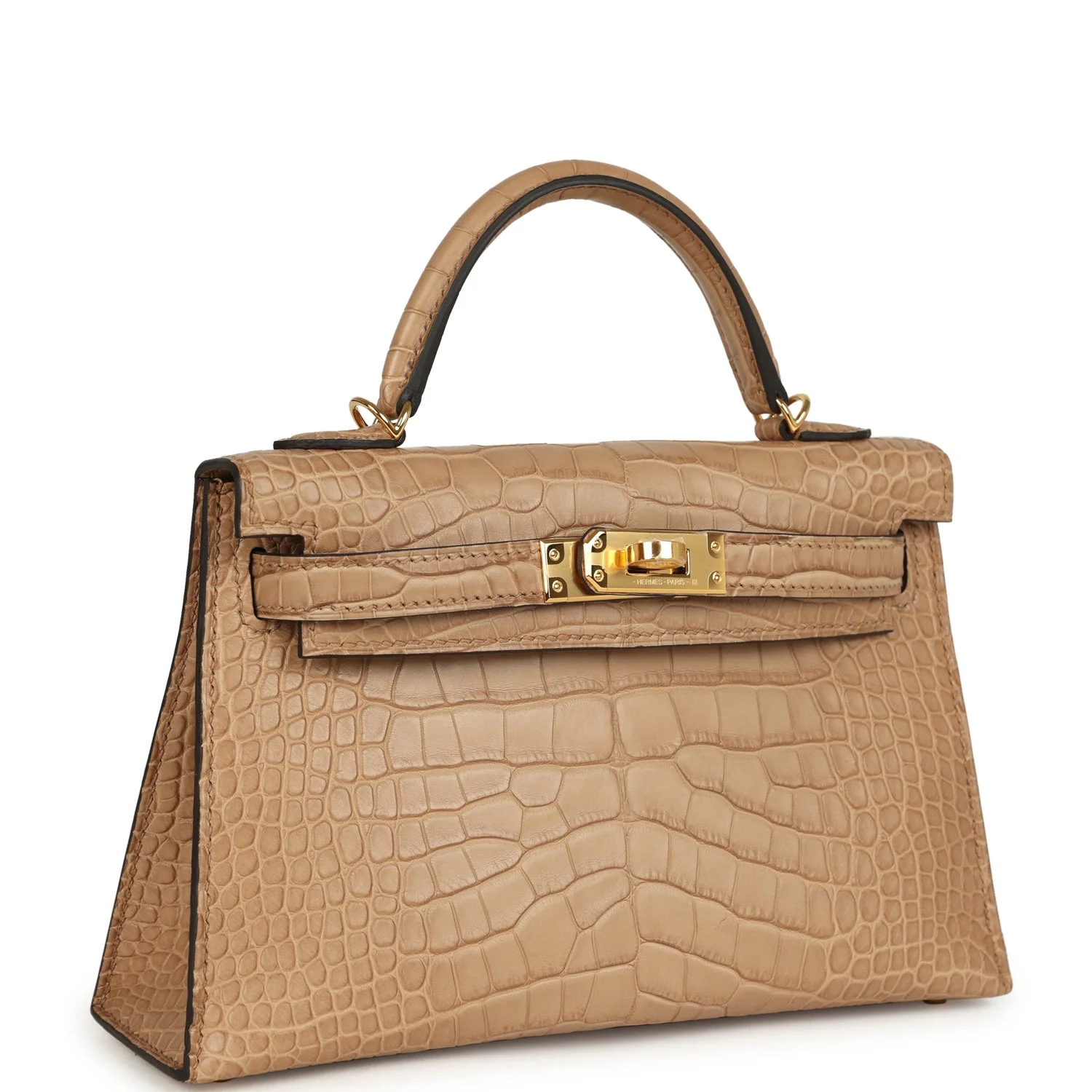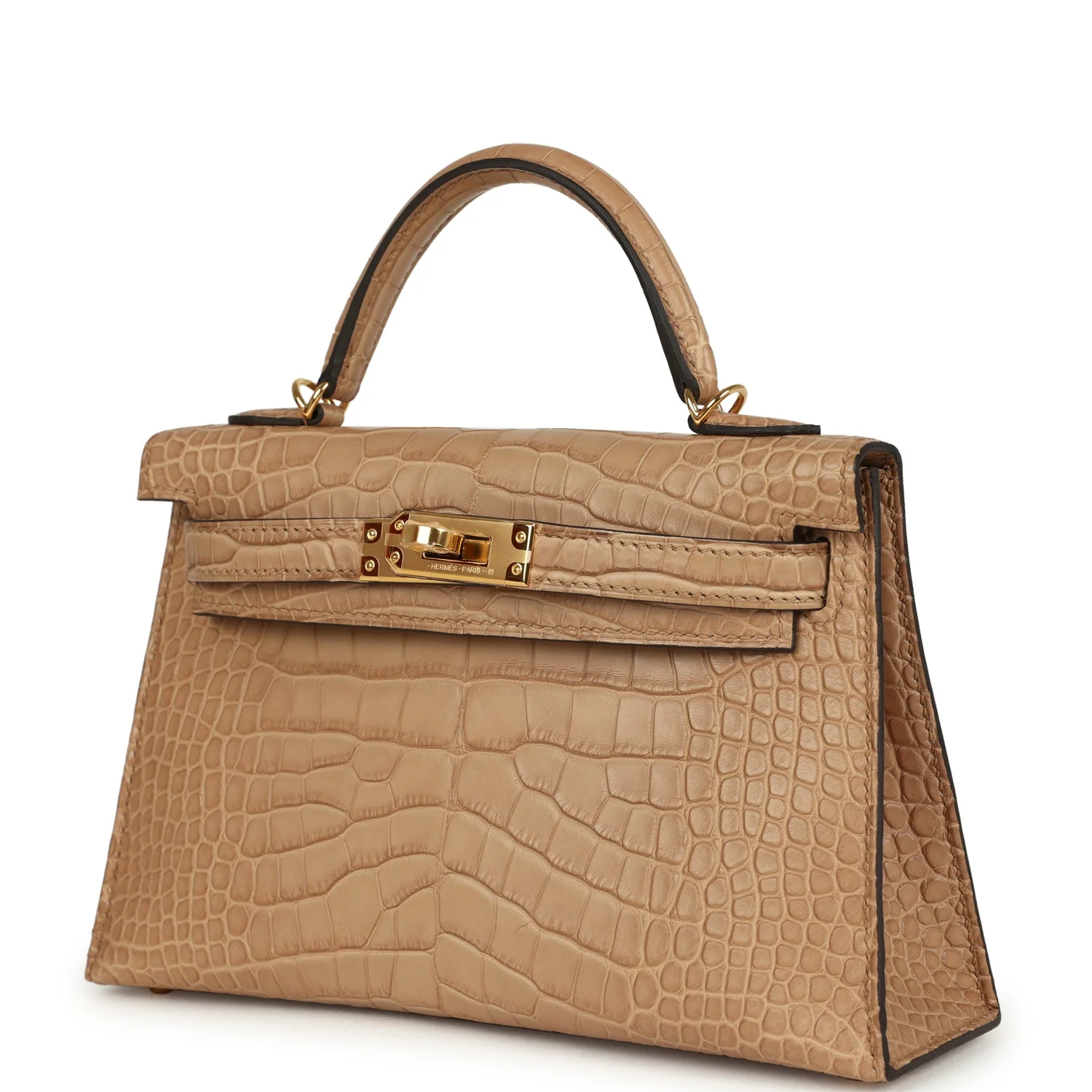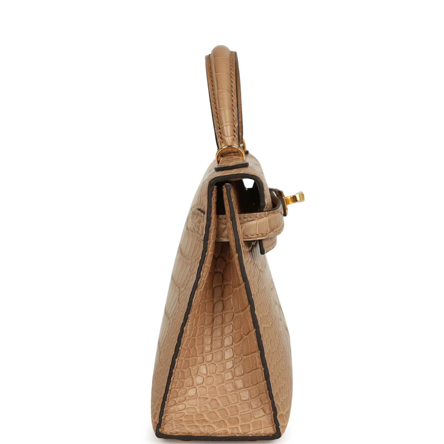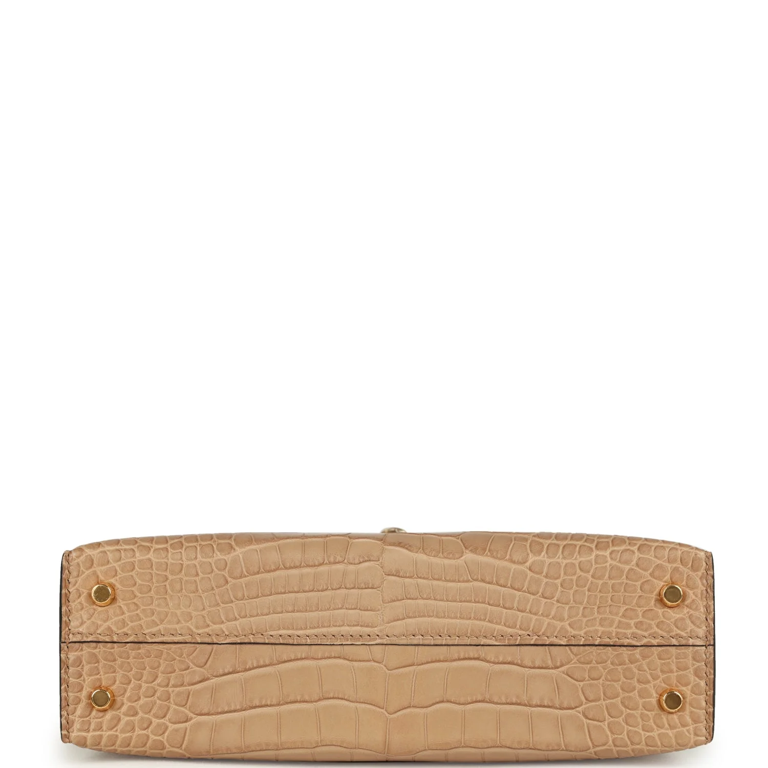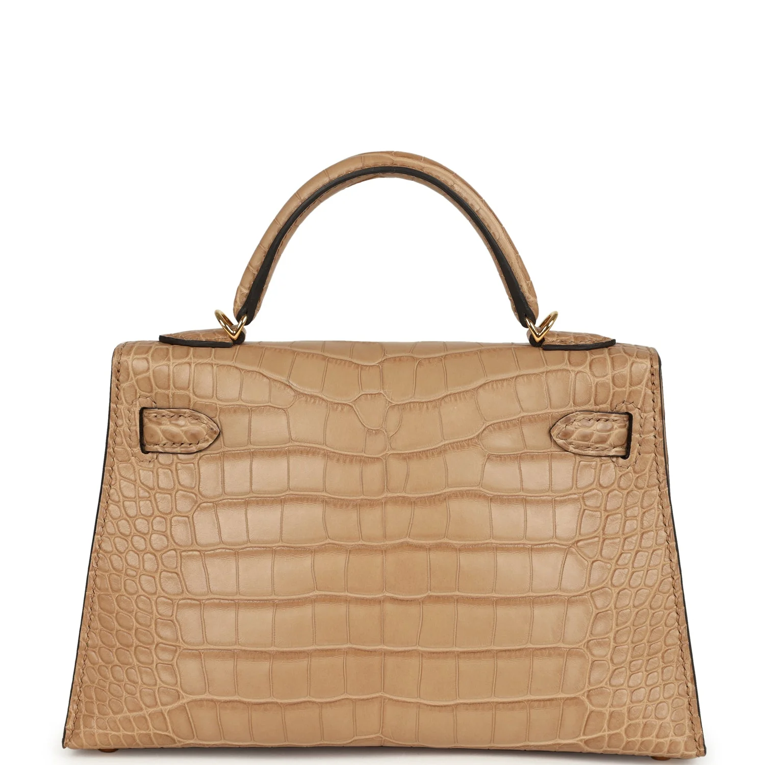 This Kelly, in the Sellier style, is in Chai Matte Alligator Mississippiensis leather with gold hardware and has tonal stitching, two straps with front toggle closure, single rolled handle and removable shoulder strap.