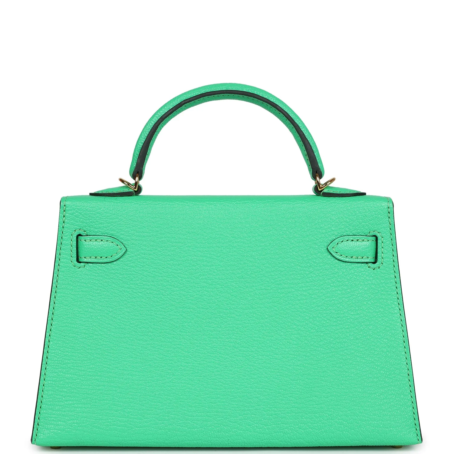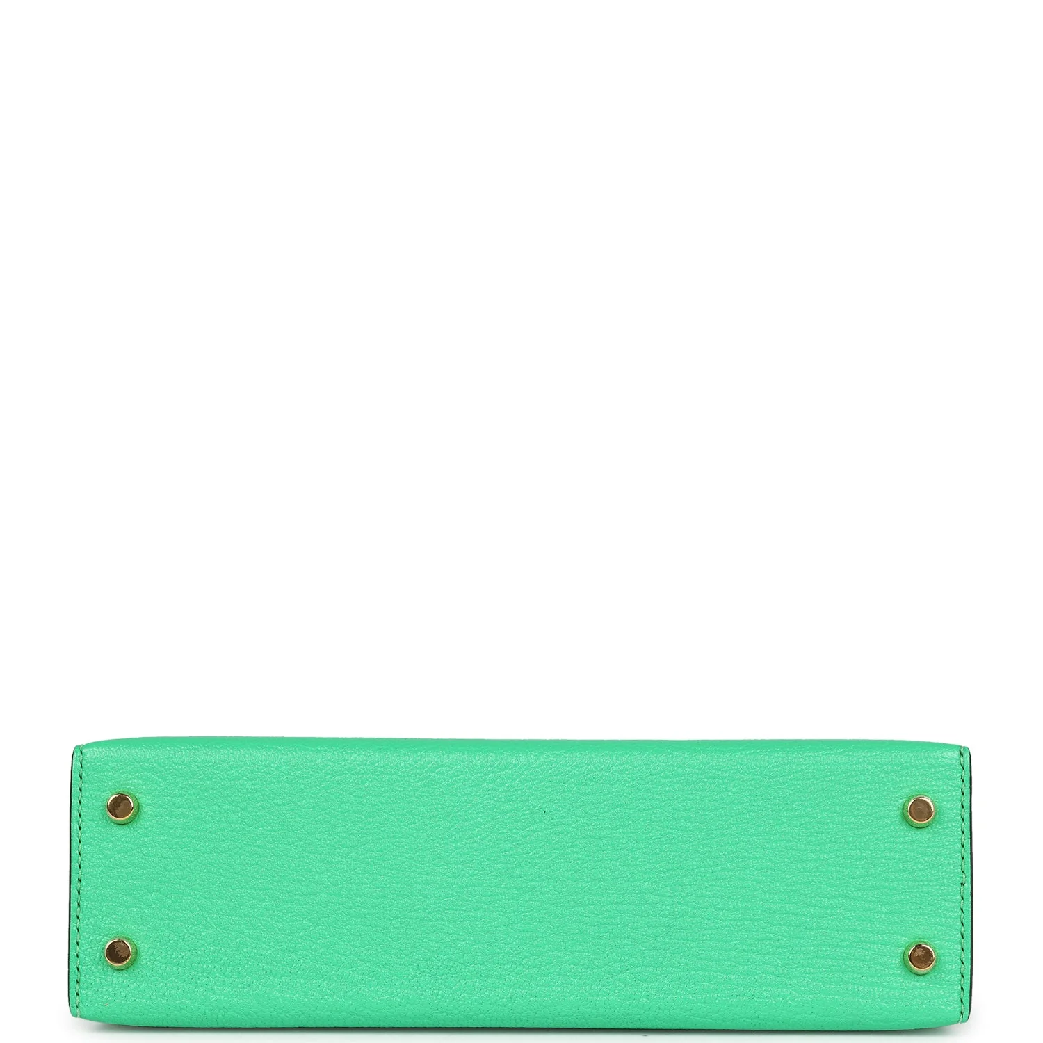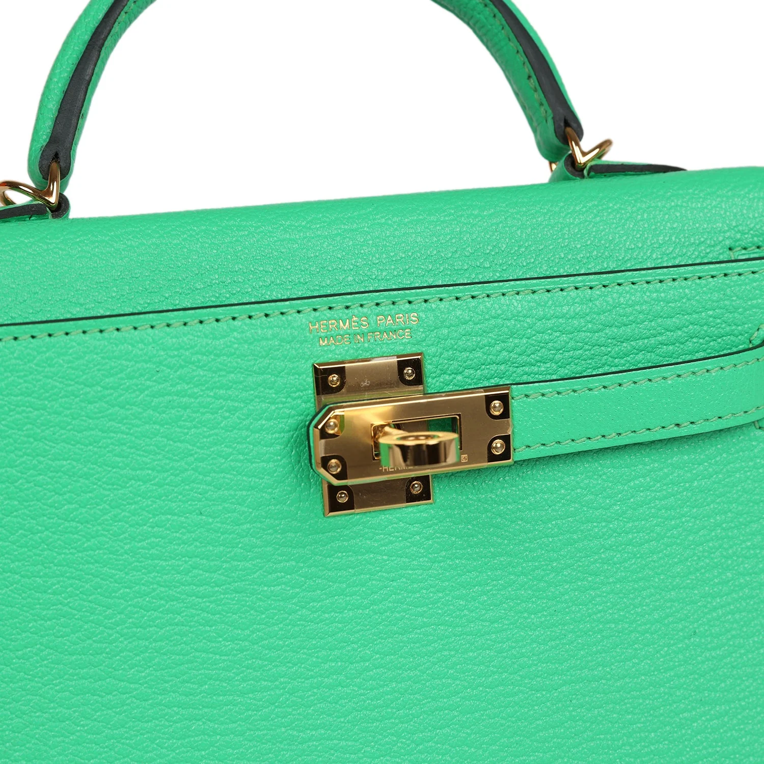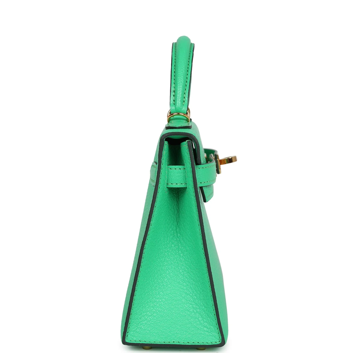 This tiny Kelly is in Vert Comics chevre mysore leather with gold hardware and has tonal stitching, two front straps with front toggle closure, single rolled handle and removable shoulder strap.