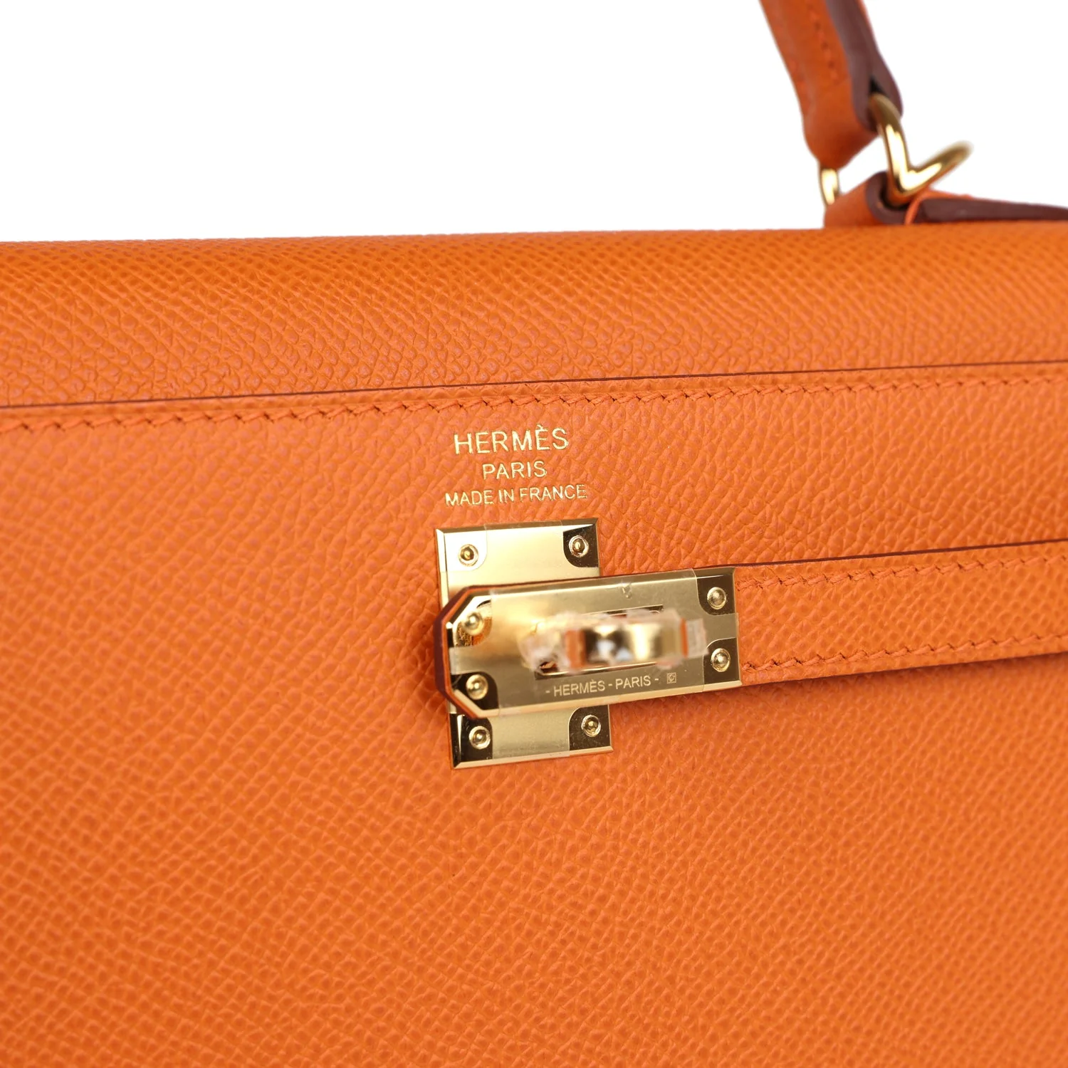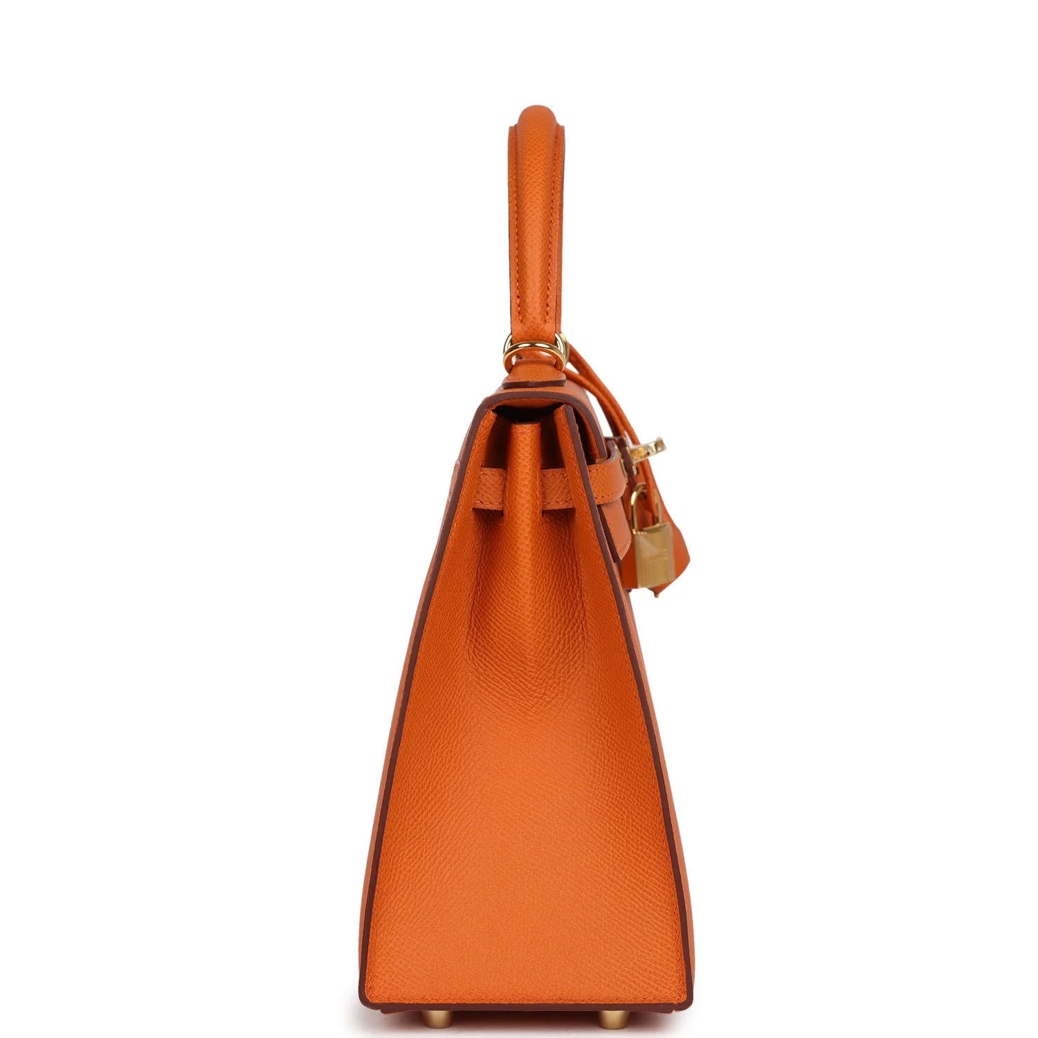 This Kelly, in the Sellier style, is in Orange epsom leather with gold hardware and has tonal stitching, two straps with front toggle closure, clochette with lock and two keys, single rolled handle and removable shoulder strap.