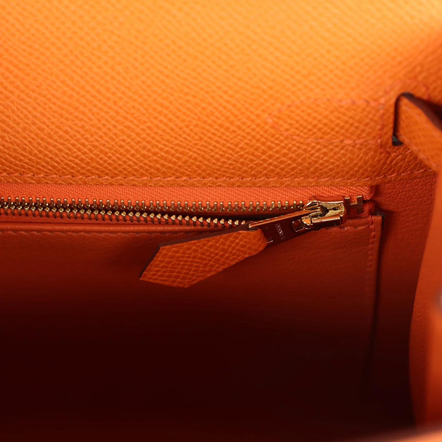 The interior is lined with Orange chevre leather and has one zip pocket with an Hermes engraved pull and one open pocket on the opposite side.