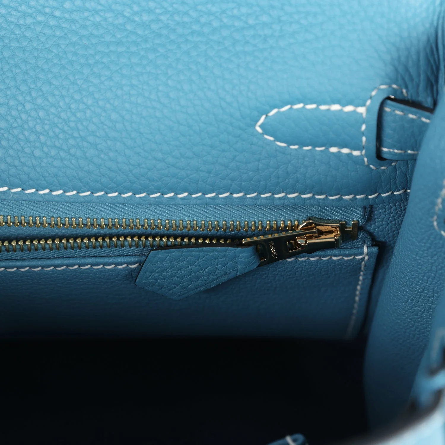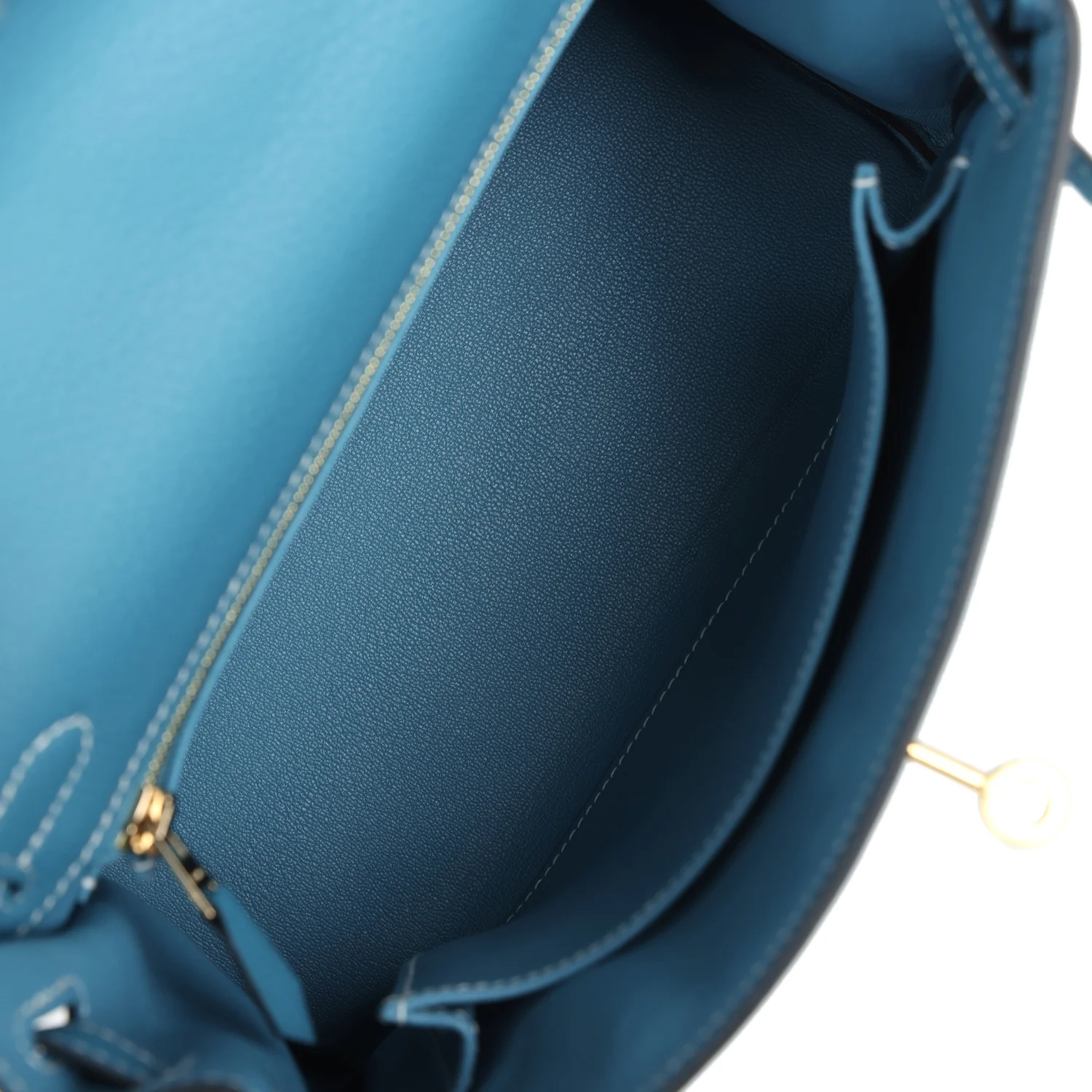 The interior is lined in New Blue Jean chevre and has one zip pocket with Hermes engraved pull and one open pocket on the opposite side.