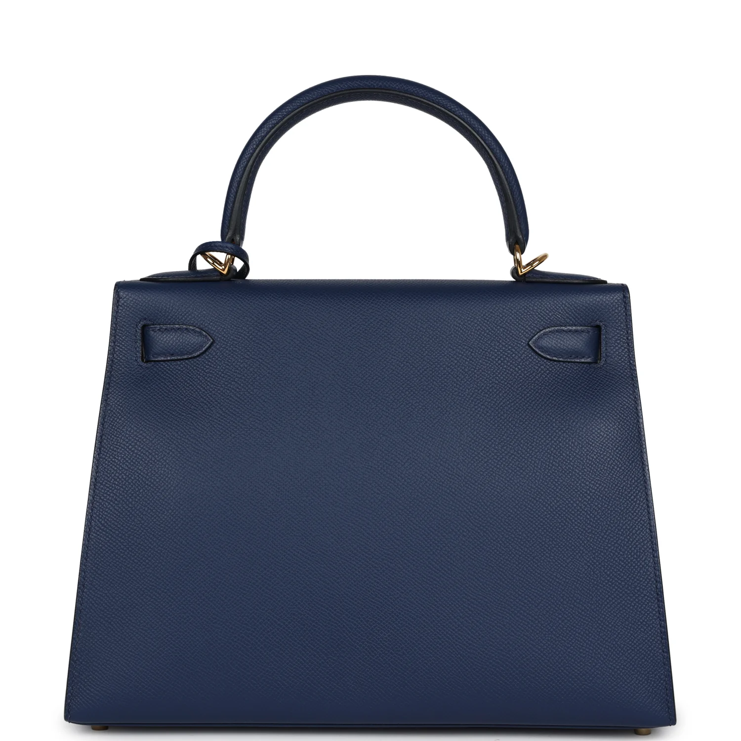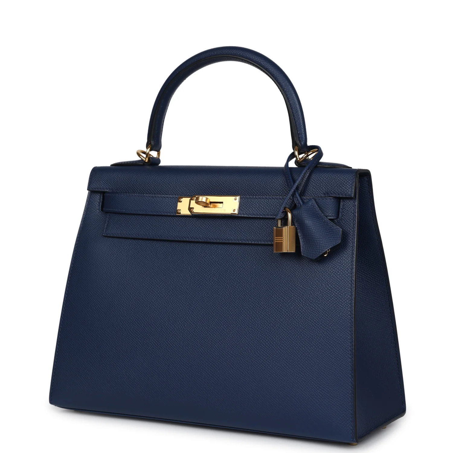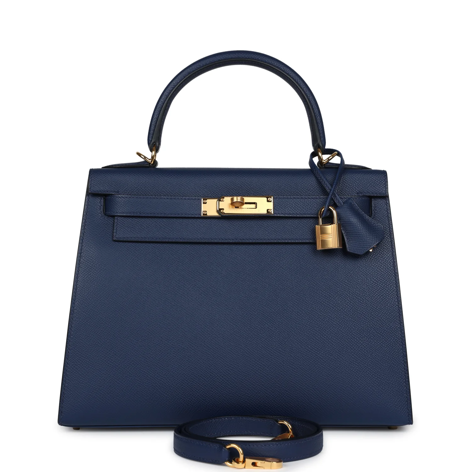 This Kelly, in the Sellier style, is in Bleu Navy epsom leather with gold hardware, has tonal stitching, front flap, two straps with center toggle closure, clochette with lock and two keys, single rolled handle and removable shoulder strap.