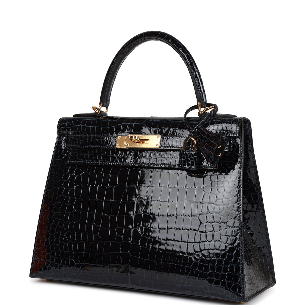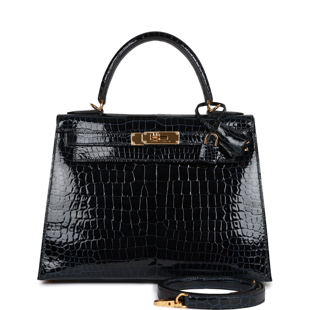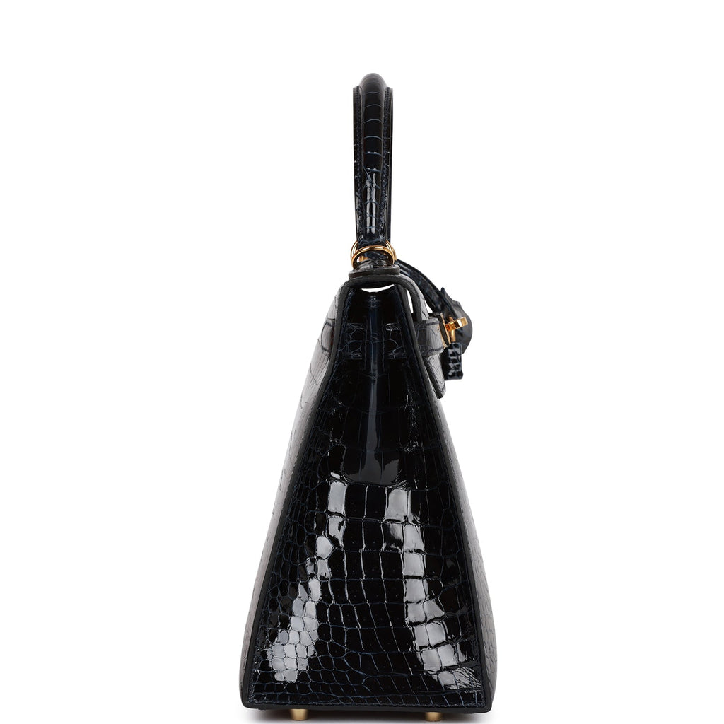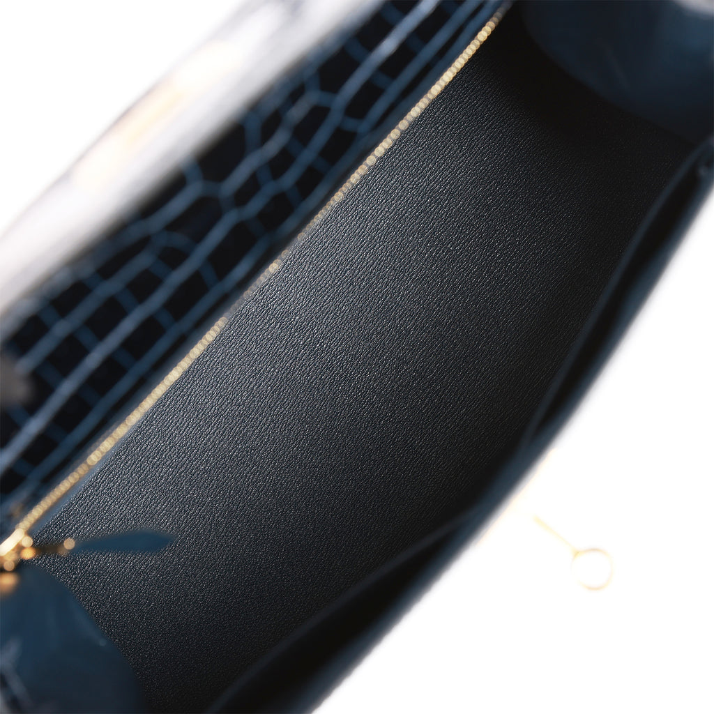 Hermes Kelly Sellier 28 Bleu Baltique Shiny Porosus Crocodile Gold Hardware
